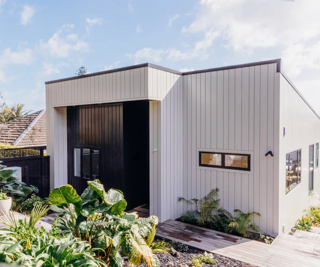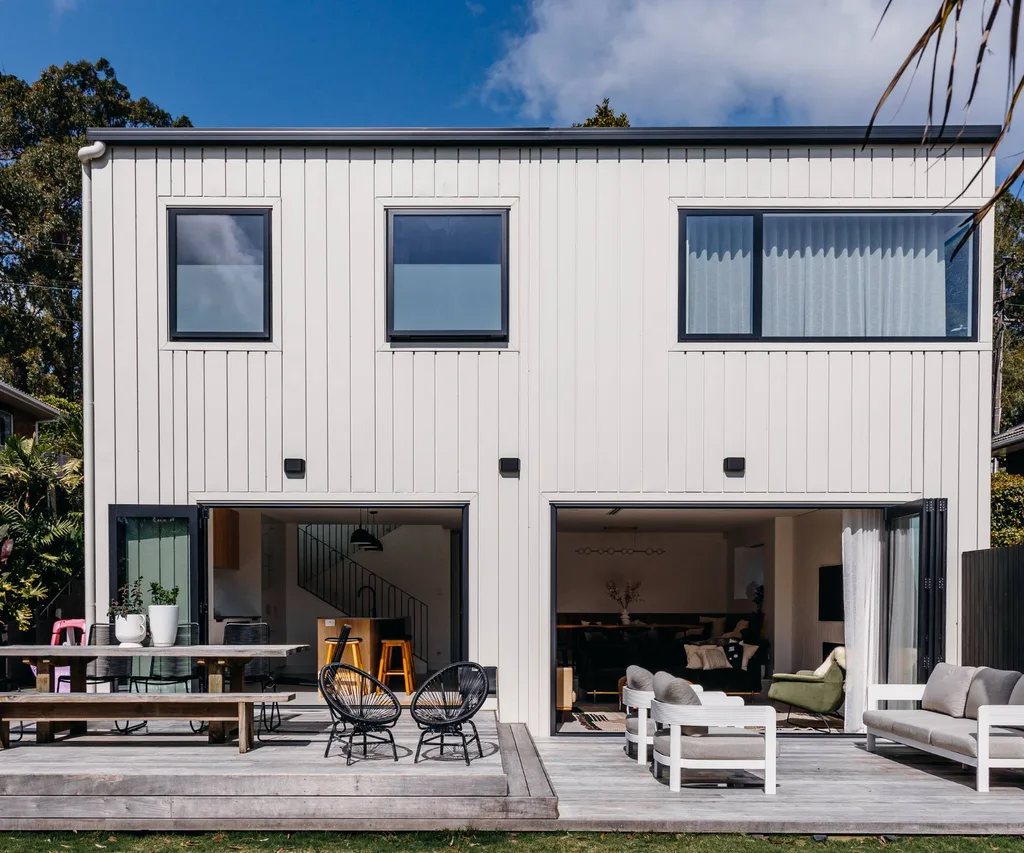 Le nouveau plan consistait à inverser la disposition – en plaçant les chambres à l’étage et le salon en bas vers le jardin arrière orienté au nord. Avec tout, à l’exception du revêtement de sol en rimu à l’étage et du toit à une pente retiré, la maison était enveloppée de plastique.