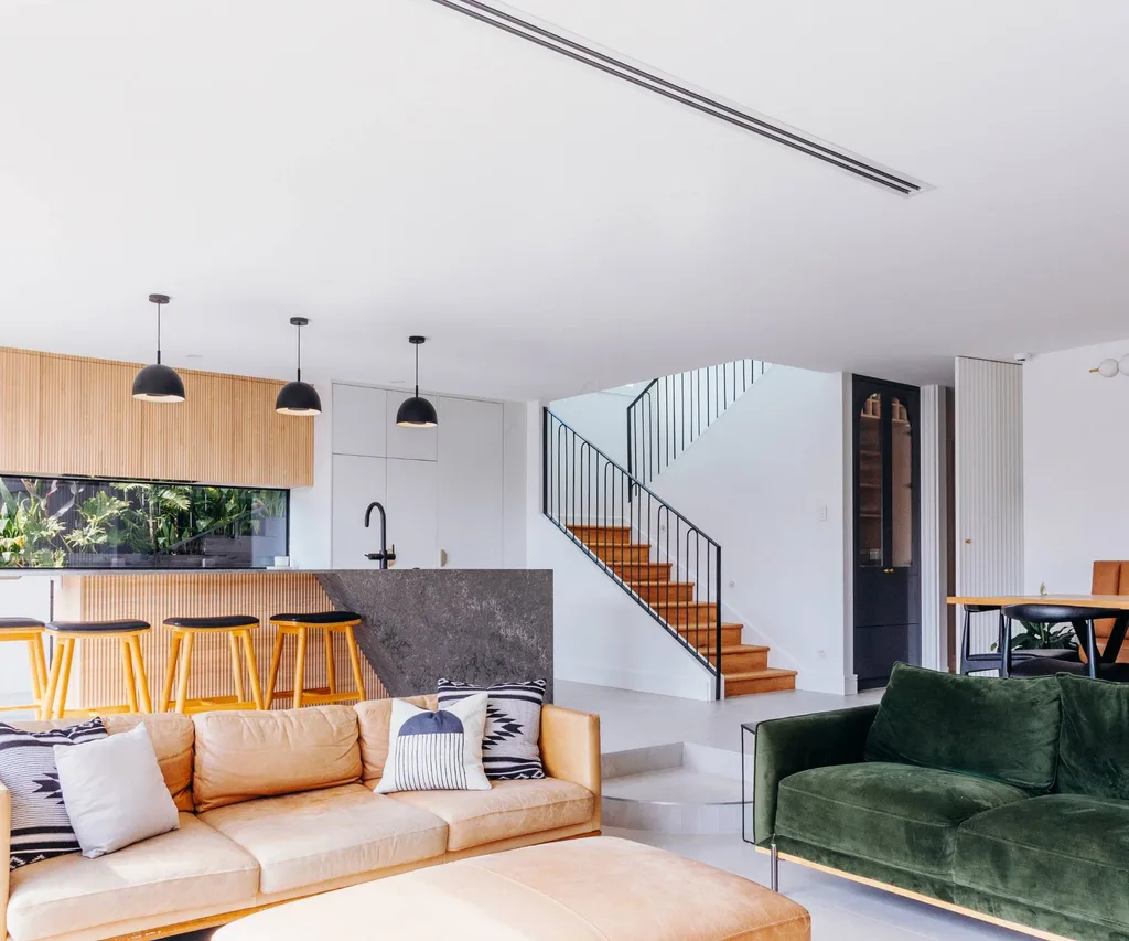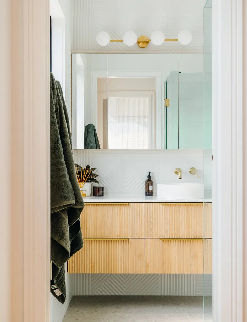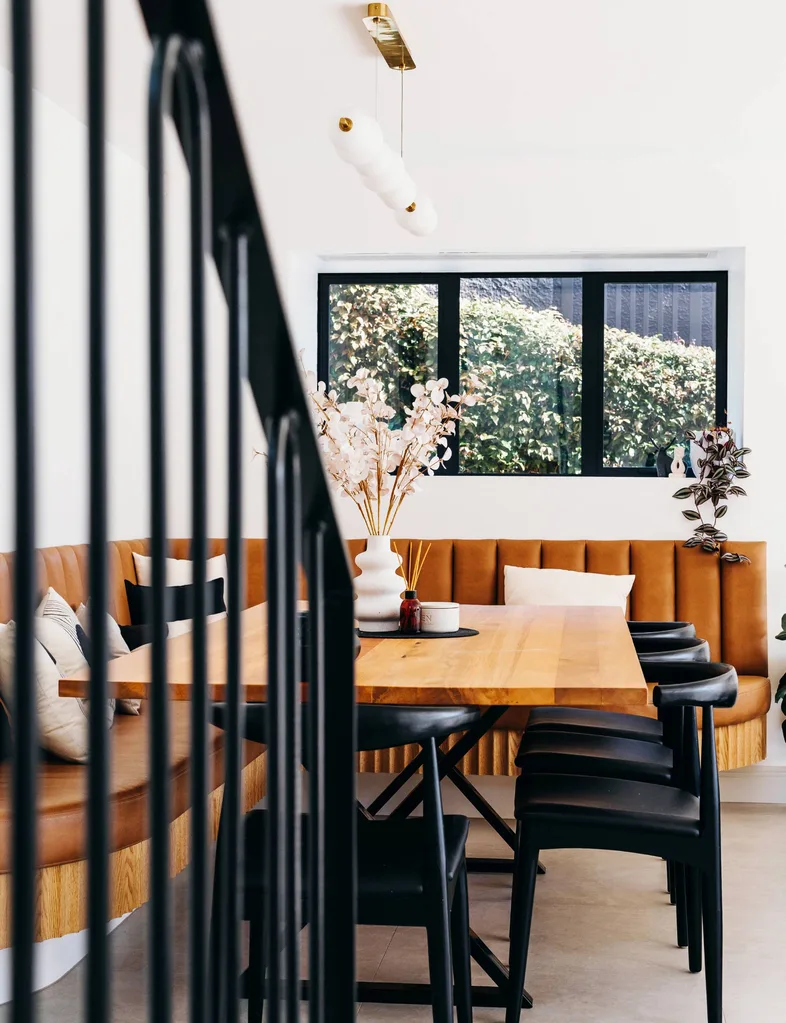 Ici, un motif répété – le profil distinctif des panneaux cannelés – tapisse l’îlot, une banquette intégrée dans la salle à manger et le mur de la cheminée. Ces courbes sont un clin d’œil contemporain aux origines art déco de la maison et apportent intérêt et caractère à ce qui est, en fait, une nouvelle construction.
