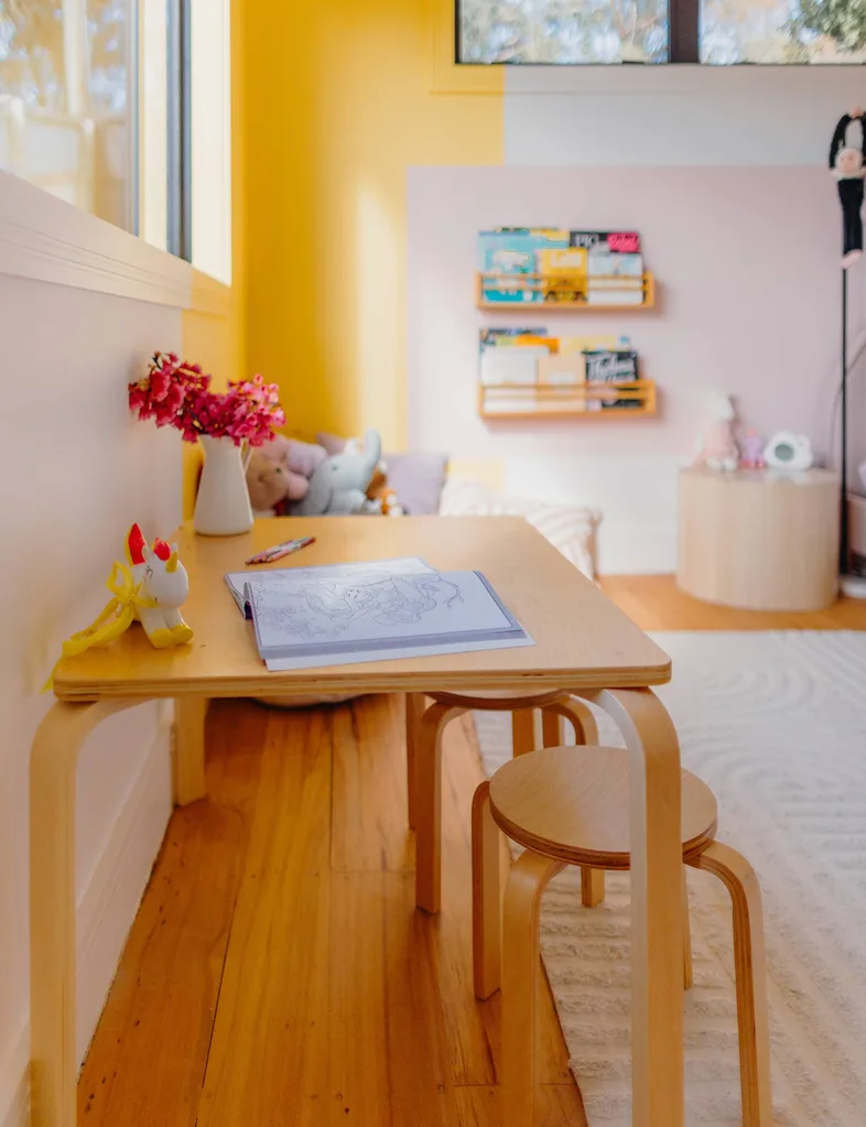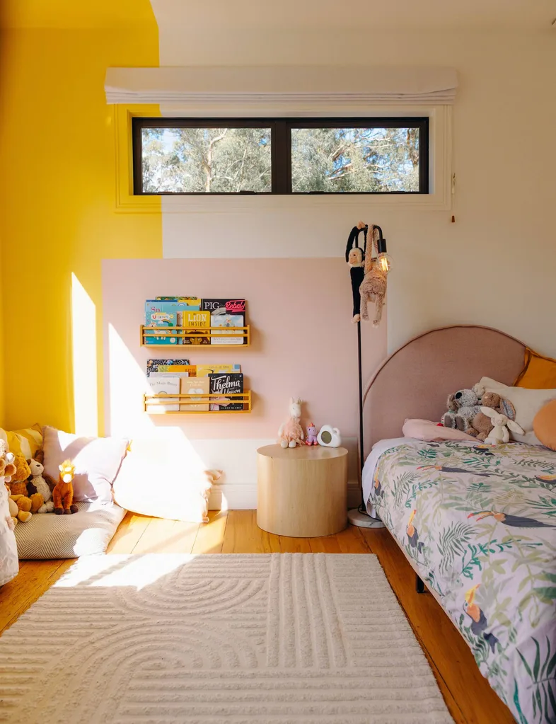Même si ce que vous ne remarquez pas – le rangement dans le grenier, sous la terrasse et dans une myriade de placards intégrés – est important, c’est ce que vous faites qui fait la plus grande impression. A l’étage, où le montant du plafond mesure 3,4 mètres, les chambres d’enfants sont des espaces ludiques. Amanda a utilisé des carrés jaunes et rose pâle pour définir un coin lecture dans un coin de la chambre d’Emilia.