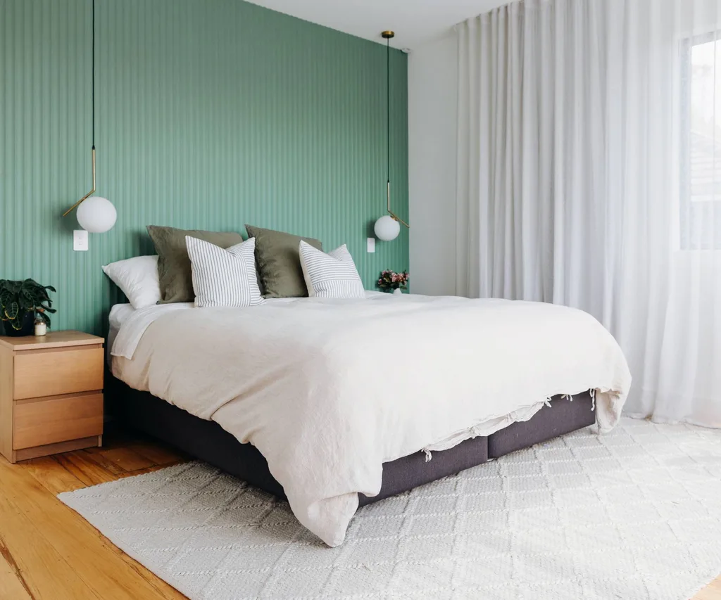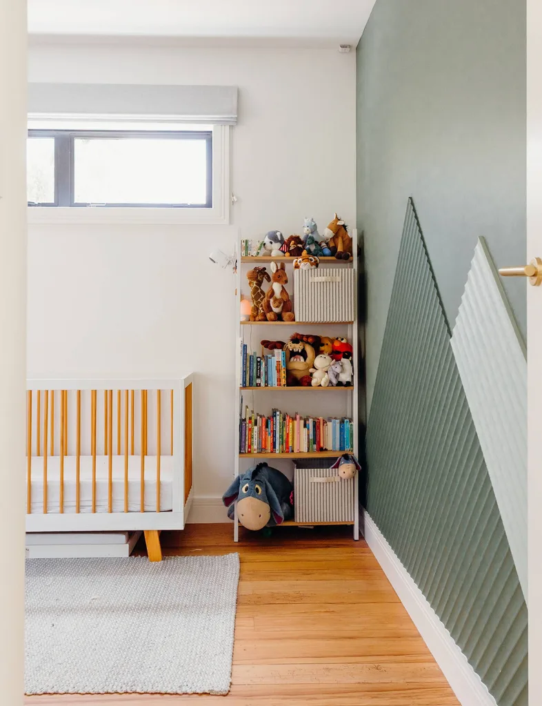 Hugh a des chutes de panneaux cannelés pour créer des « montagnes » sur son mur, peints dans un joli vert serein.