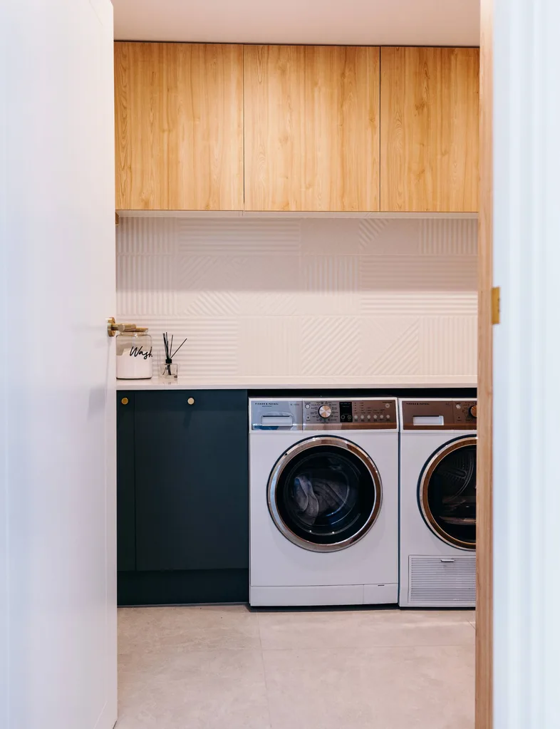 Nous avons fait de bonnes affaires sur les carreaux lors des soldes. De plus, les armoires de buanderie, que nous avons installées nous-mêmes, ont ensuite été confiées à des ébénistes.