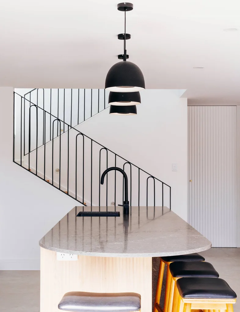 Chaque jour, les repas ont lieu sur un banc remarquable doté d’un côté angulaire en cascade et d’un surplomb en demi-lune pour permettre aux jeunes enfants de s’asseoir facilement pour le petit-déjeuner. La pierre reconstituée d’un gris profond a été la seule décision de Mike en solo.