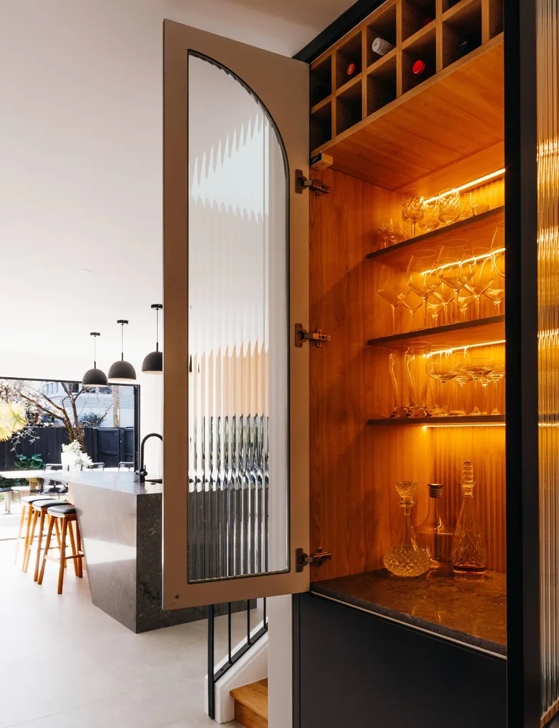 Le bar conçu sur mesure, doté d’un support en pierre, en verre cannelé et en bois cannelé. On aurait pu mettre un placard, mais cela ajoute tellement de cachet. La cheminée du salon, car la maison est entièrement canalisée pour le chauffage et la climatisation et est entièrement à double vitrage. C’est un joli point focal, ajoutant de l’ambiance les nuits d’hiver.