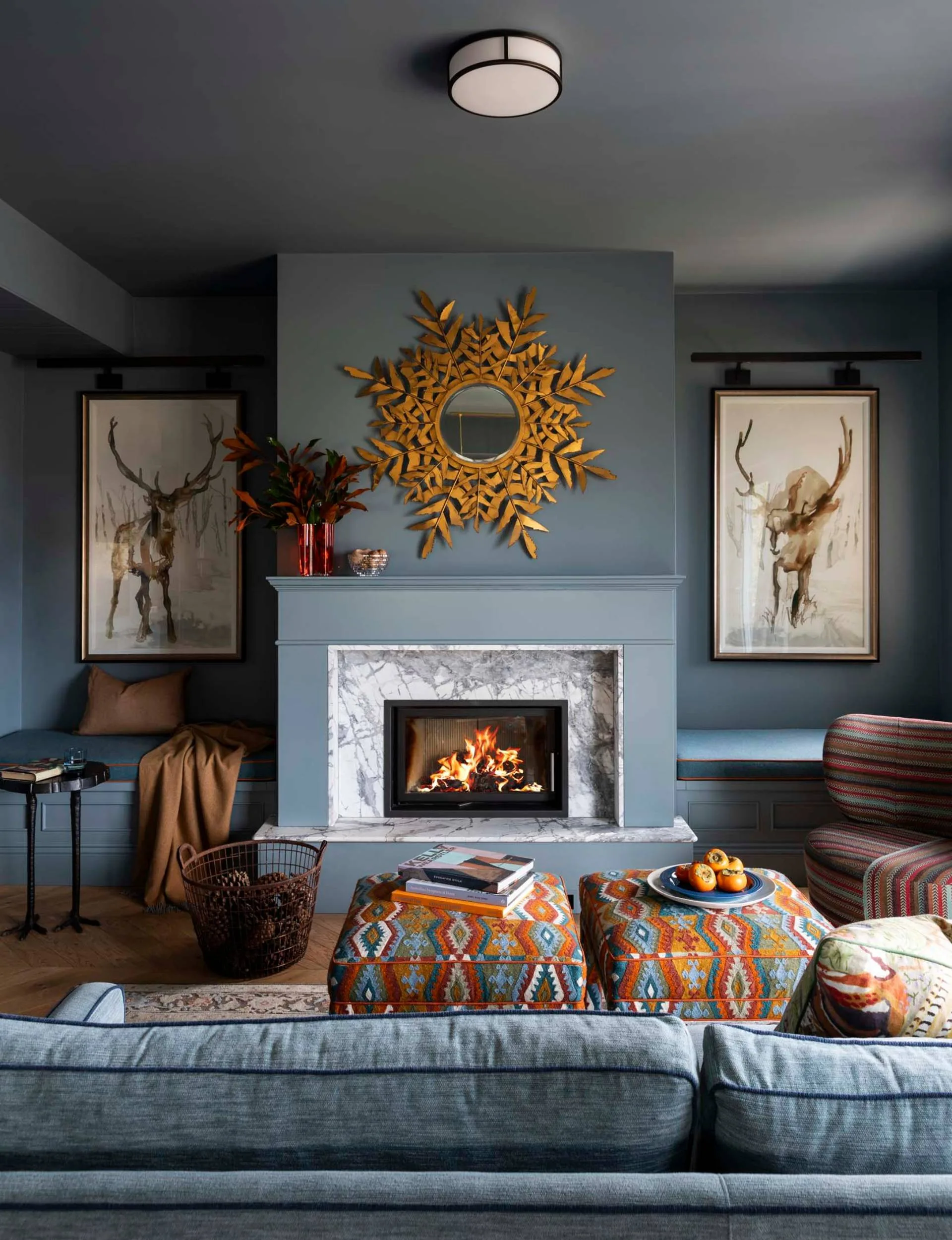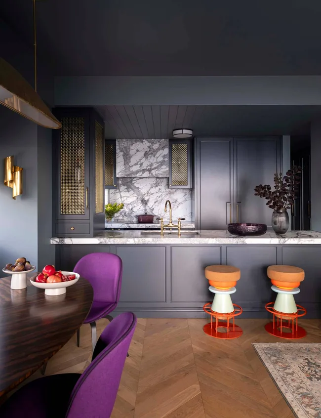 Ils voulaient un espace pour replacer aux limites, avec des touches de couleur et de espièglerie. «L’appartement entier vous enveloppe de couleur – des bleus sensuels, des charbon de bois d’encre, des violets, des oranges, de la chartreuse, de la marine et du rose vif», explique Kate. Le résultat est délicieusement contradictoire: cocooning mais revigorant, luxueux mais finalement chaleureux et accueillant.