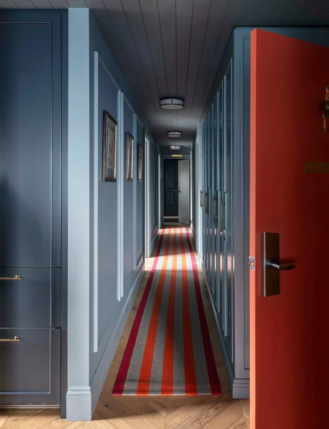 «Nous avons soigneusement conçu chaque pouce carré du couloir avec une menuiserie personnalisée, donc même si c’est un espace de transition avec un grand rangement, il se sent également et est si beau avec des illustrations, un éclairage et un coureur absolument magnifique», explique Kate. Le coureur est composé de 50% de Nouvelle-Zélande et de 50% de laine britannique.