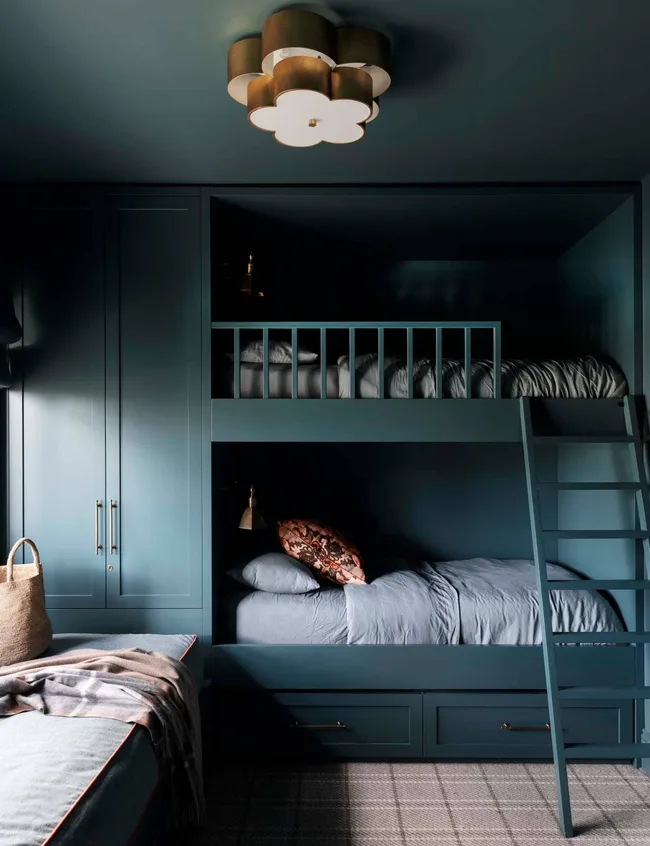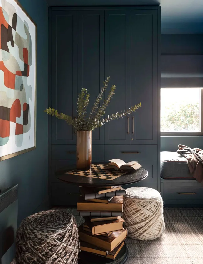 Il est difficile d’imaginer un espace plus simple que la salle des enfants pour se recroqueviller dans les nuits hivernales. La menuiserie et le plafond peintes dans la baie de Dulux Jimbaran aident à créer un effet d’embrassement. Bien que principalement un espace de couchage pour les enfants, toute la famille peut se réunir ici pour regarder la télévision ou jouer à des jeux.