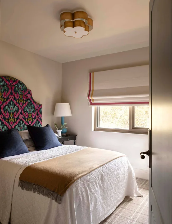 Les propriétaires travaillant de l’appartement, Kate a intégré des espaces de bureau dans chacune des chambres. Dans l’une des chambres de la maison, une chaise de vanité en arc de Snelling Studio sert de chaise de bureau digne d’un boudoir. Les teintes chaudes remontent à la tête de lit du tissu Lee Jofa Leyland.