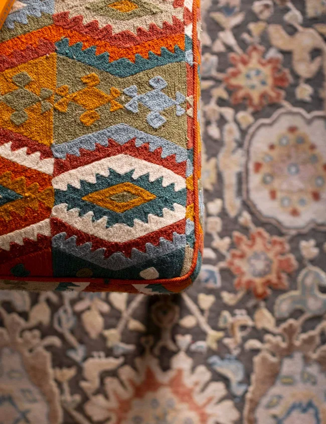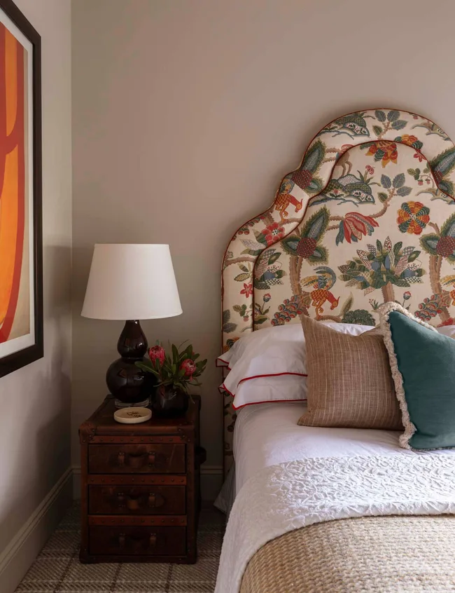 Caractéristiques de stockage dans chaque chambre pour s’assurer que la famille a beaucoup de place pour cacher les éléments essentiels. Dans la chambre principale, Kate a mélangé des motifs avec la tête de lit Ikat dans le tissu Pierre Frey Pitaya équilibré par des coussins dans le tissu Dudley Glen de Ralph Lauren et le tapis à motif tartan.