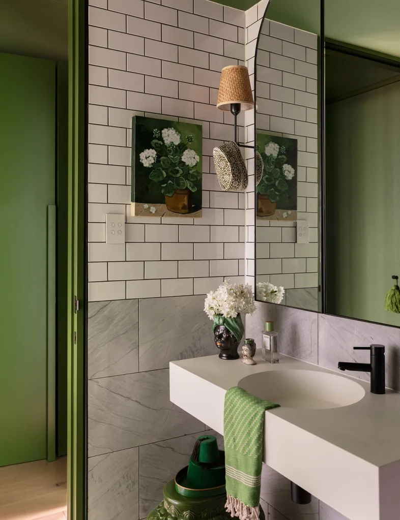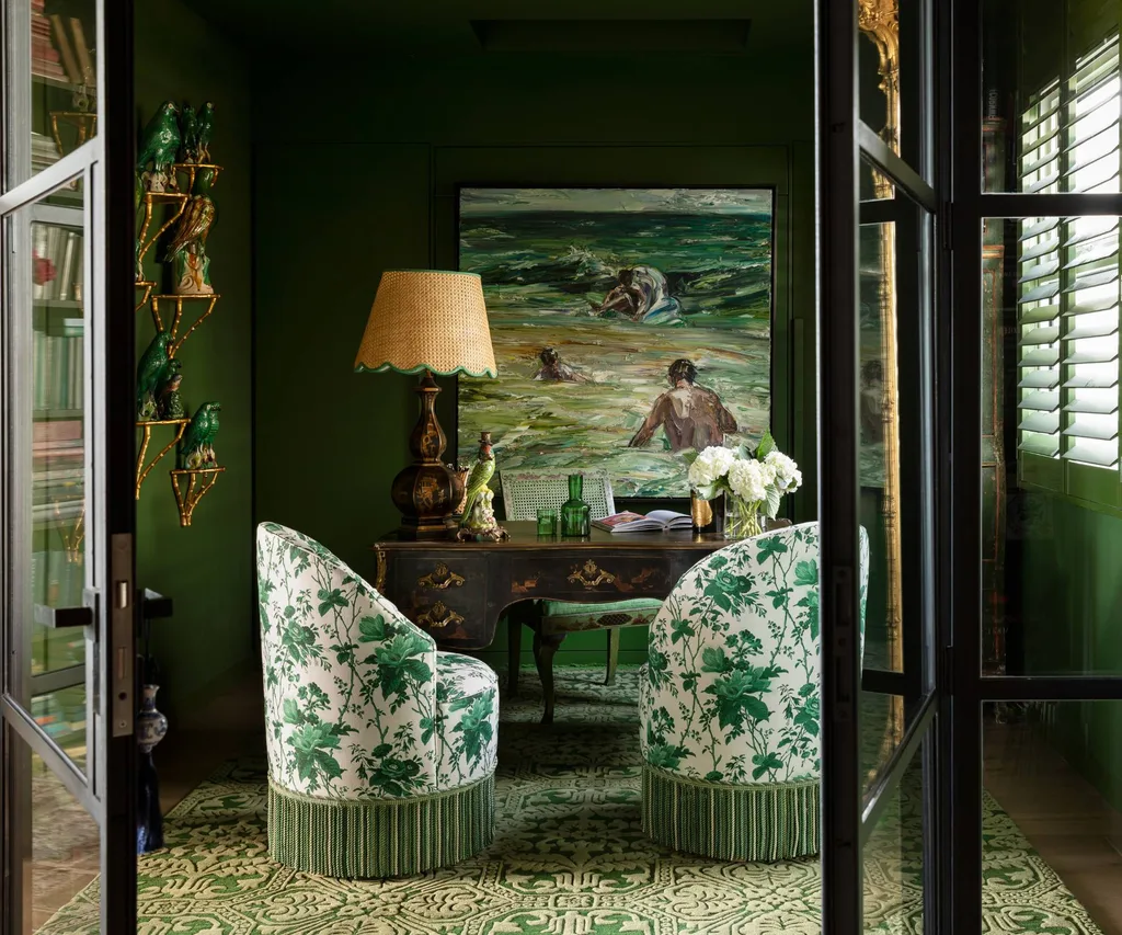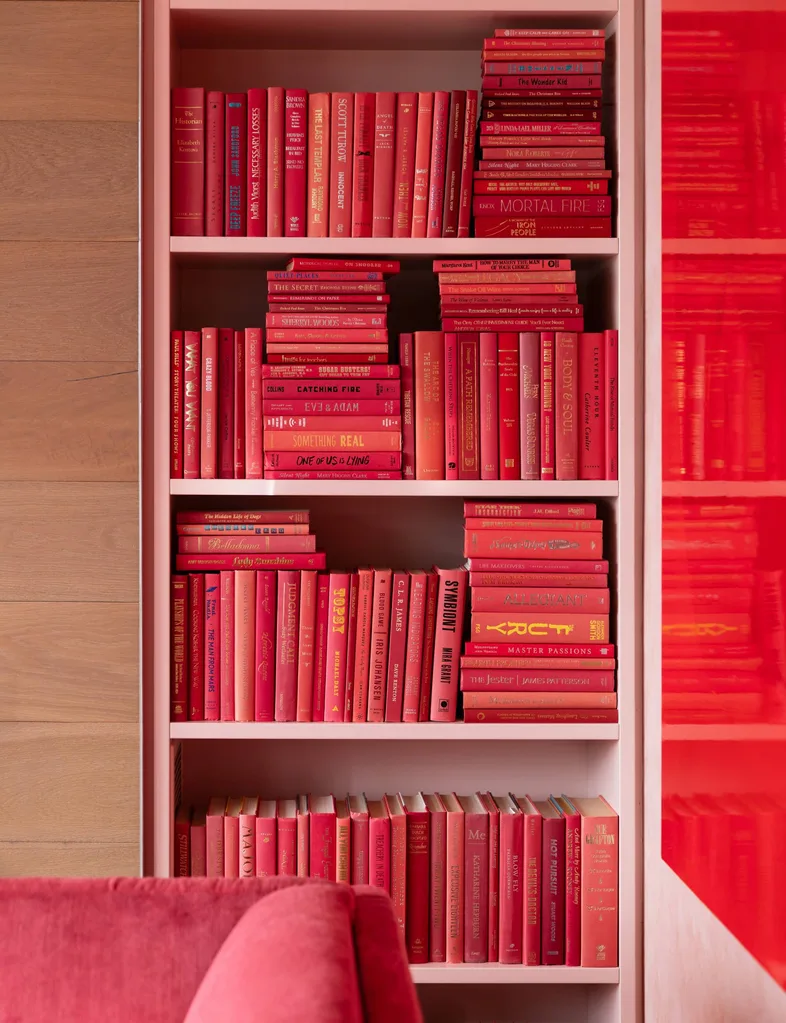 NOUS ADORONS… la couleur saturée de Chyka a organisé une maison kaléidoscopique remplie d’art comprenant une bibliothèque baignée de vert (ci-dessus), un salon aux tons fuchsia et un salon surnommé la « salle d’or ». La « chambre rose » est sa préférée. « C’est un espace très joyeux et surprenant. Vous ne pouvez pas imaginer que quelqu’un puisse mettre autant de couleurs dans une si petite zone. »