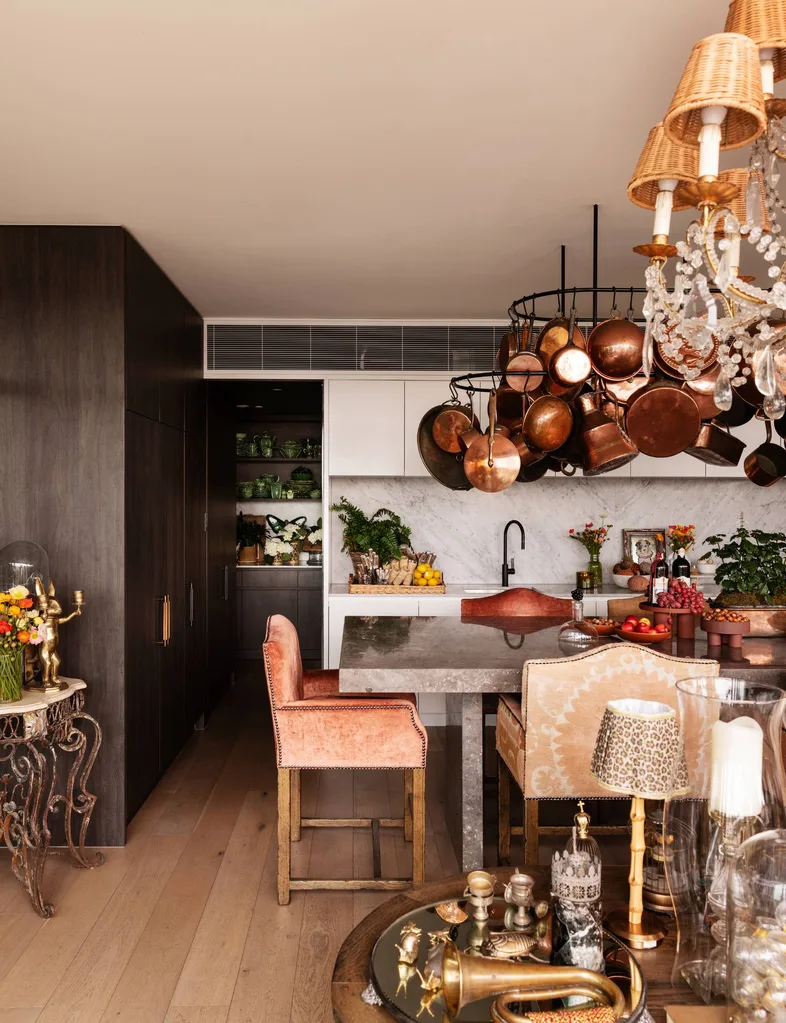 Ensuite, il y a les 120 kg de casseroles en cuivre françaises brillantes suspendues au-dessus du banc de l’îlot de cuisine.