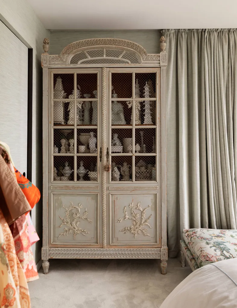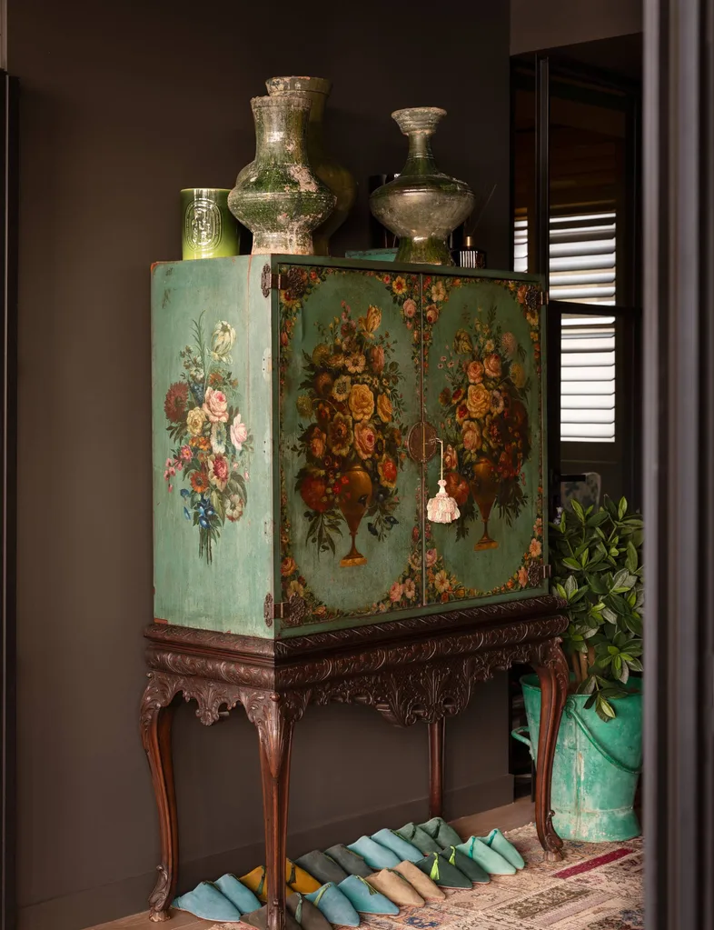 Le couple a ajouté des lucarnes et, à la place des murs, des portes et des fenêtres en verre à charpente d’acier pour éclairer les intérieurs. Chaque coin est rempli d’antiquités et de curiosités qui racontent une histoire, de la cachette de choux verts de Chyka au paon empaillé qui accueille les invités dans le hall.