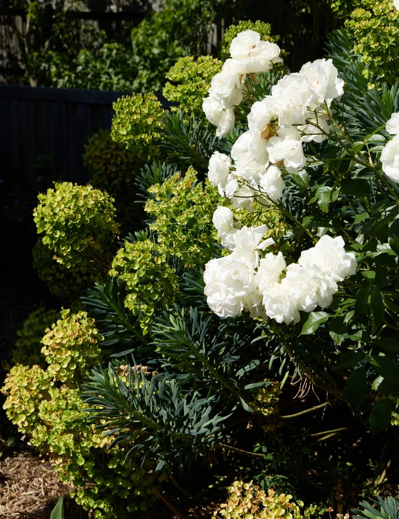 Les roses iceberg dans le parterre de buis du jardin de devant, qui étaient antérieurs à sa belle-mère, ont été déterrées et remplacées principalement par des plantes vivaces autour des mandarines, des citrons et des canneberges de Nouvelle-Zélande (également connues sous le nom de goyave du Chili, Ugni molinae).