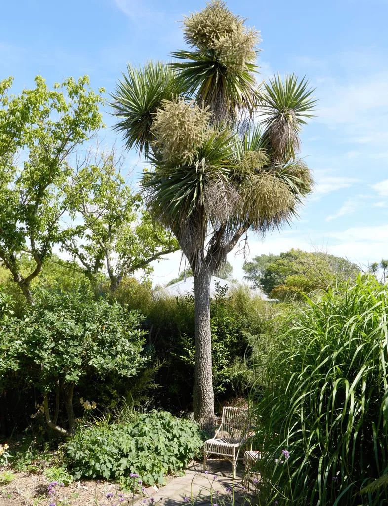 Les chemins plus petits tissés à travers le lit à l’avant de la terrasse sont également bien utilisés pour permettre un meilleur accès à la pelouse ; des arbustes ont été retirés pour permettre une meilleure vue depuis la maison. Ici, à l’ombre tachetée d’un vieux kōwhai, fleurissent ligulaires à feuilles géantes, alstroemeria, sceau de Salomon, rengarenga et capucines.