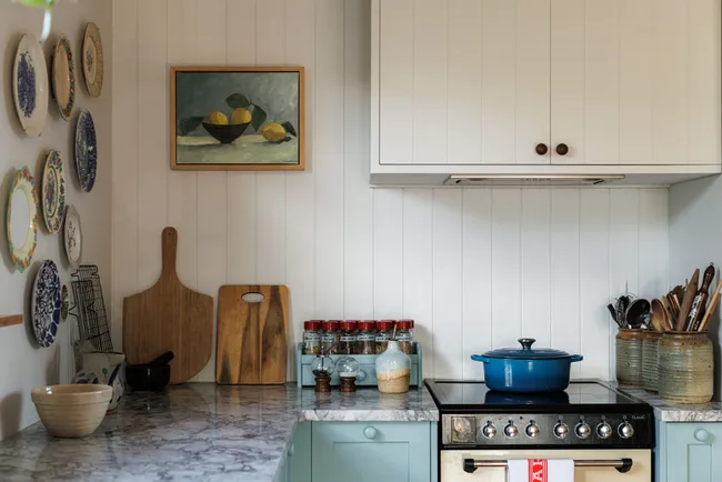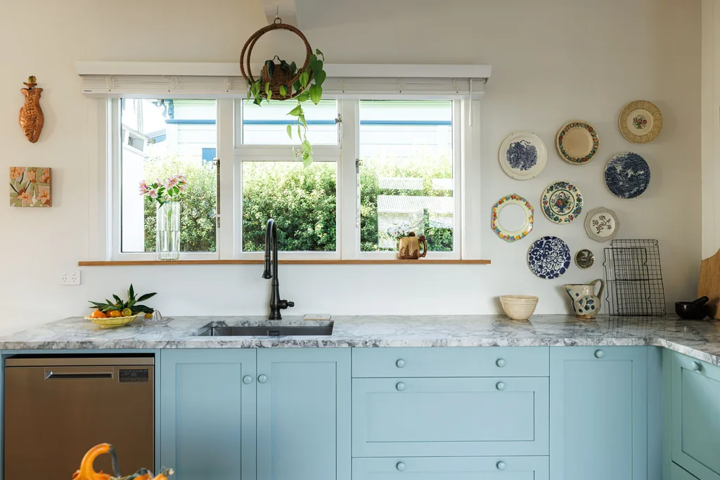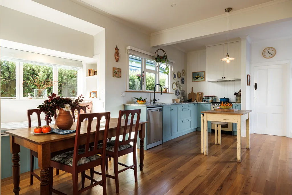 Pour compléter le look, les armoires ont été peintes à la main dans des couleurs apaisantes Aalto et finies avec des boutons en bois peints assortis. Une série de langue et roove Rimu recyclé a été posée sur un pli pour remplacer le sol stratifié, restaurant une touche du personnage d’origine de la maison. Un établi français vintage avec des bassins d’émail cachés a été ajouté comme îlot de cuisine, qui est maintenant utilisé pour stocker les fruits et légumes.