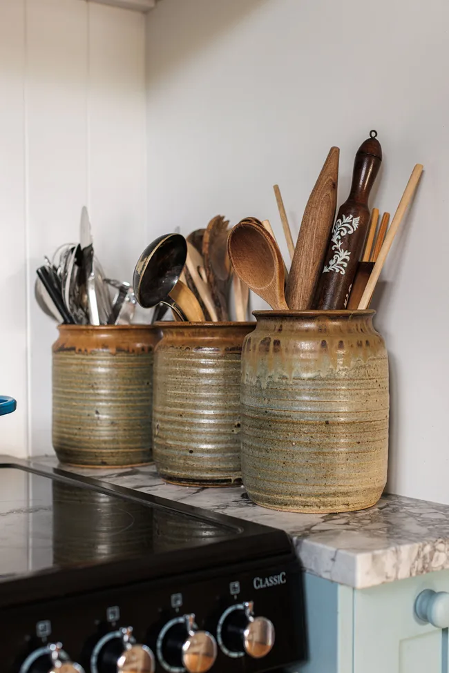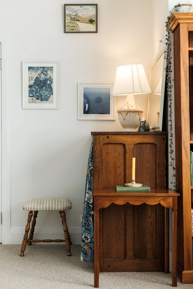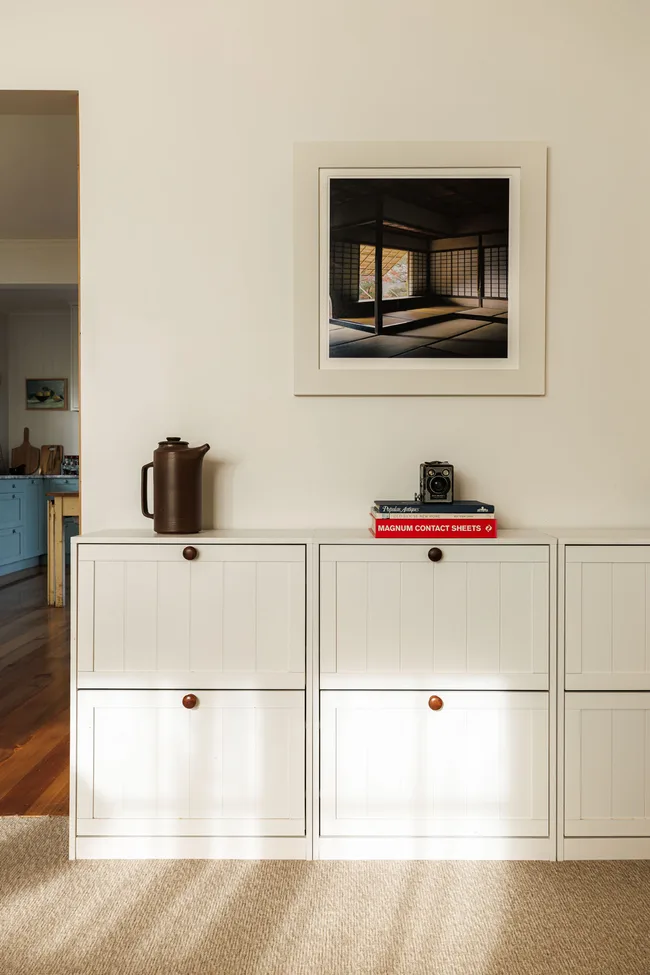 L’art contemporain est placé aux côtés de l’art vintage et antique; Si elle achète un morceau de nouveaux meubles, elle mettra de vieux boutons d’armoires dessus (comme elle l’a fait avec la vanité de la salle de bain). Elle a également étudié l’histoire de l’art japonais, il y a donc une forte influence de cet artisanat avec certaines des pièces qu’elle recueille – que les pièces soient japonaises ou, disons, les potiers néo-zélandais inspirés du Japon.