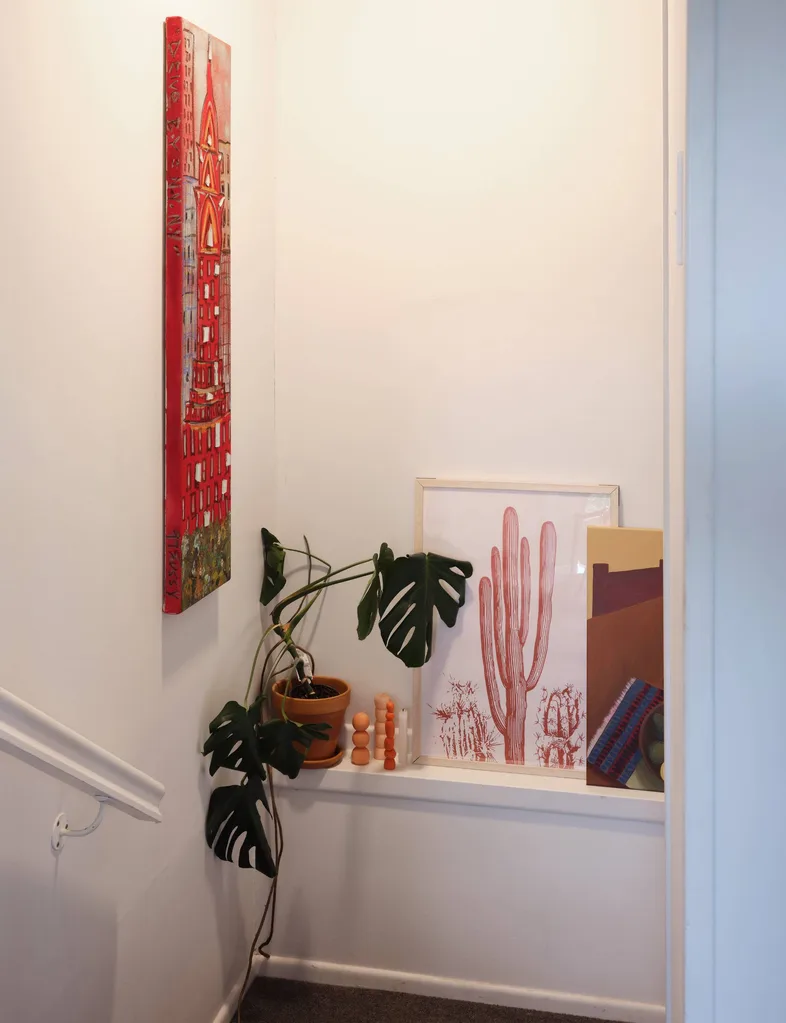 « Quand j’ai emménagé dans la maison pour la première fois, j’avais besoin de choses pour remplir les murs, donc je ferais de petites nuits de peinture avec des amis, et je couvrirais des toiles et les mettrais sur les murs. »